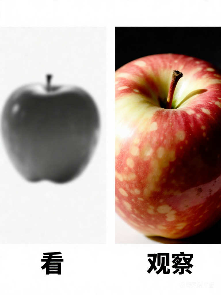 (此处建议插入一张对比图:左边是模糊的苹果轮廓,标注“看”;右边是清晰的苹果特写,标注出颜色、斑点、蒂等细节,标注“观察”)